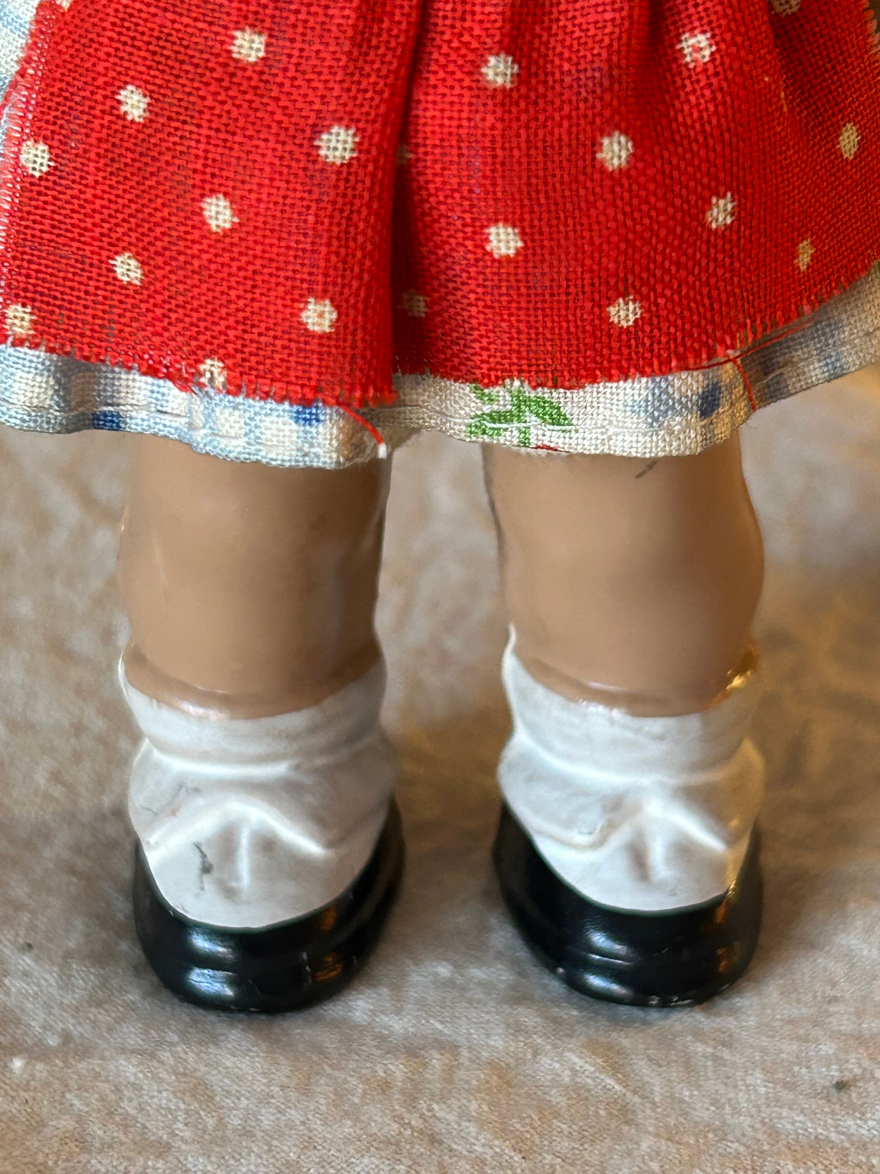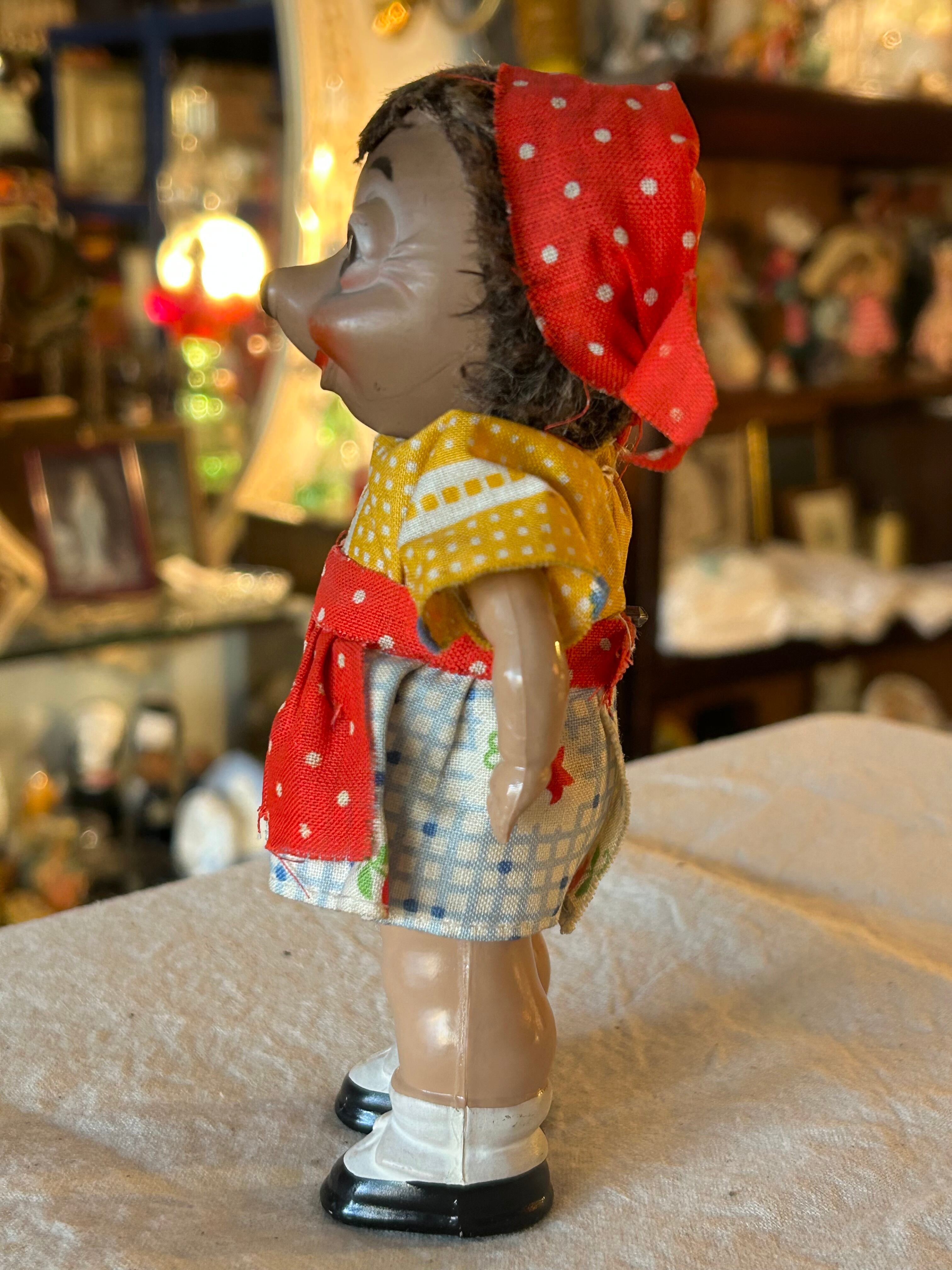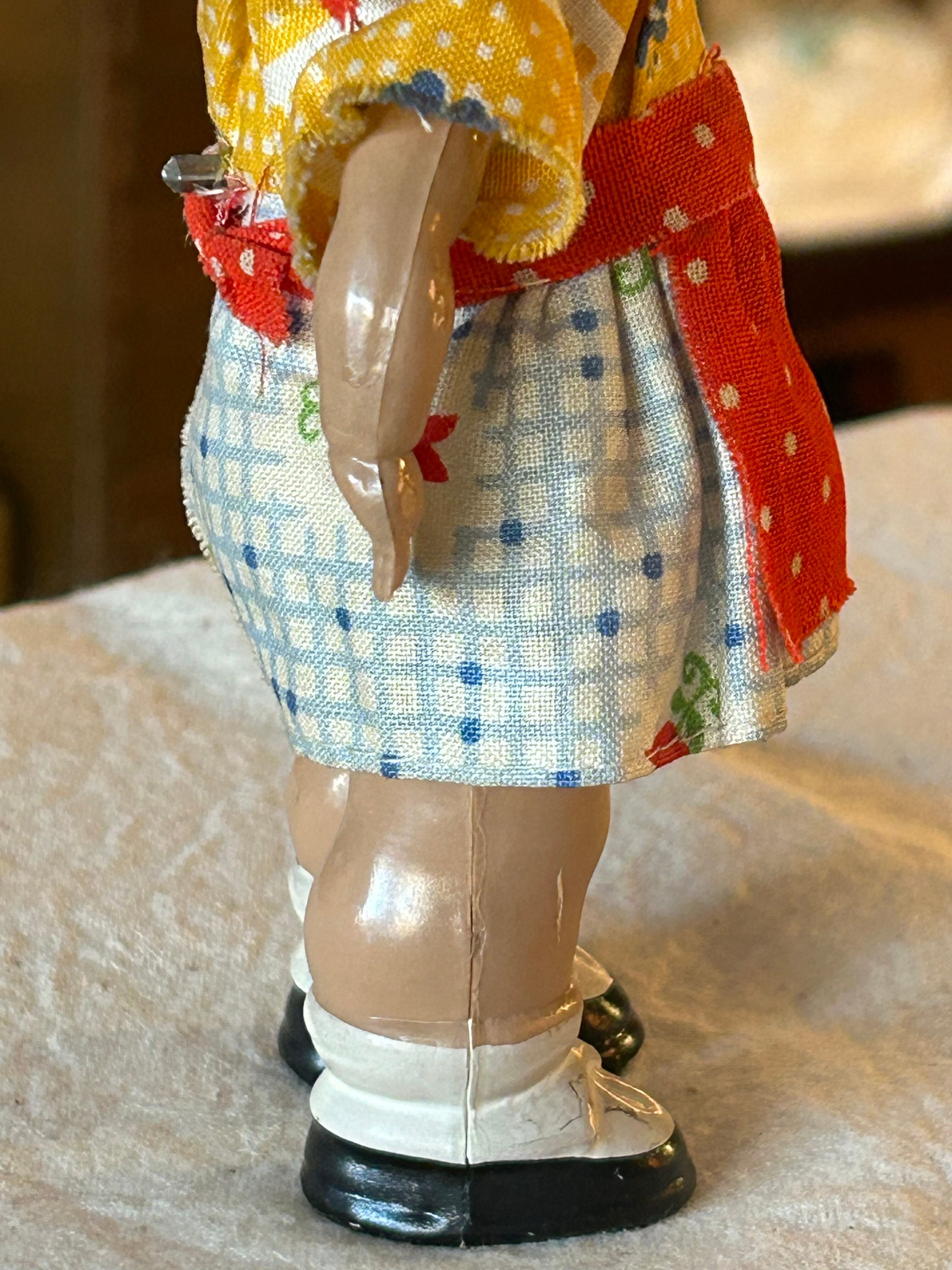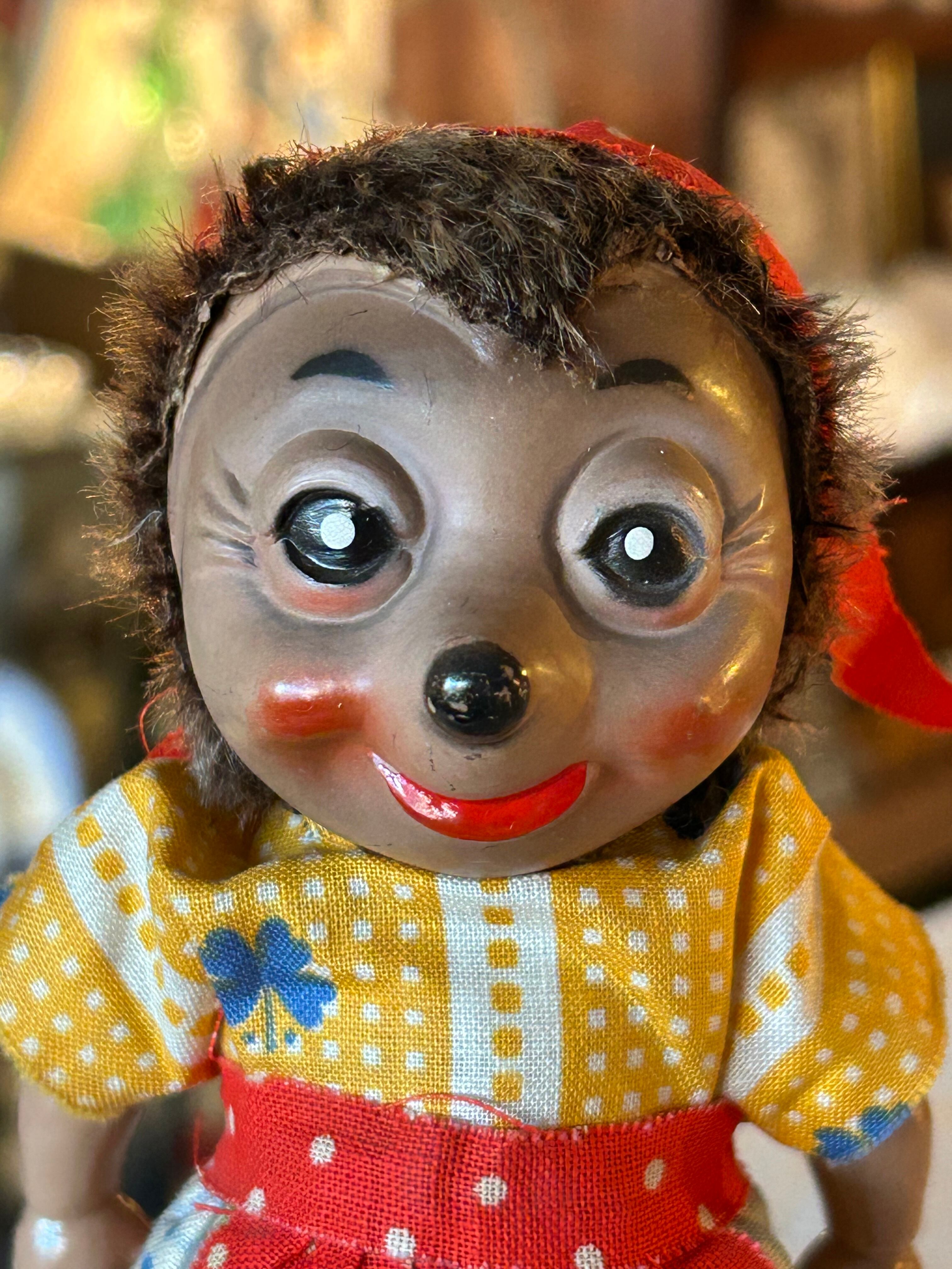 にっこりとした表情や色鮮やかなお洋服、頭部のモヘア、軽やかなセルロイドボディなど、当時のシュタイフらしい温かみのあるつくりが魅力です。