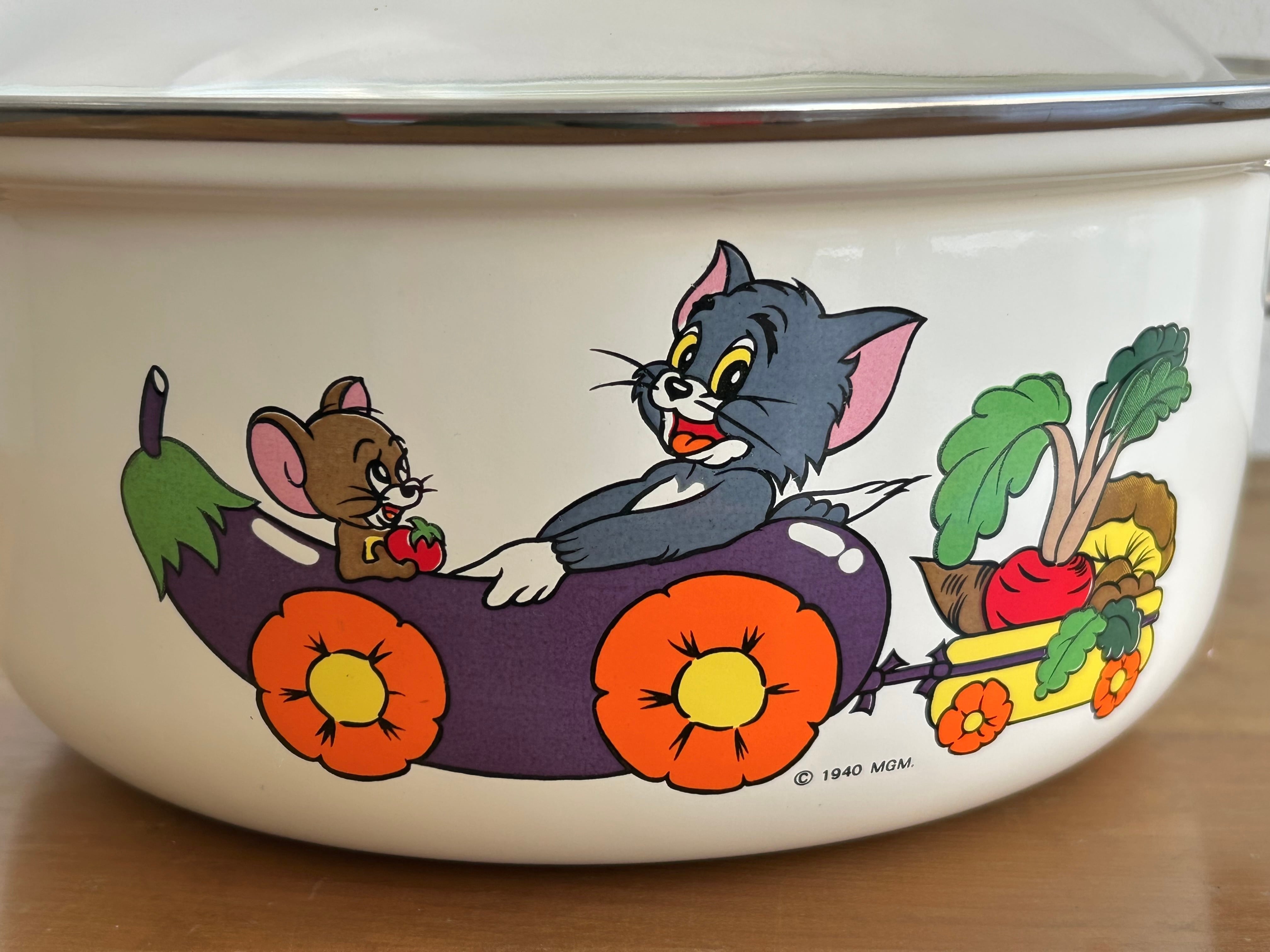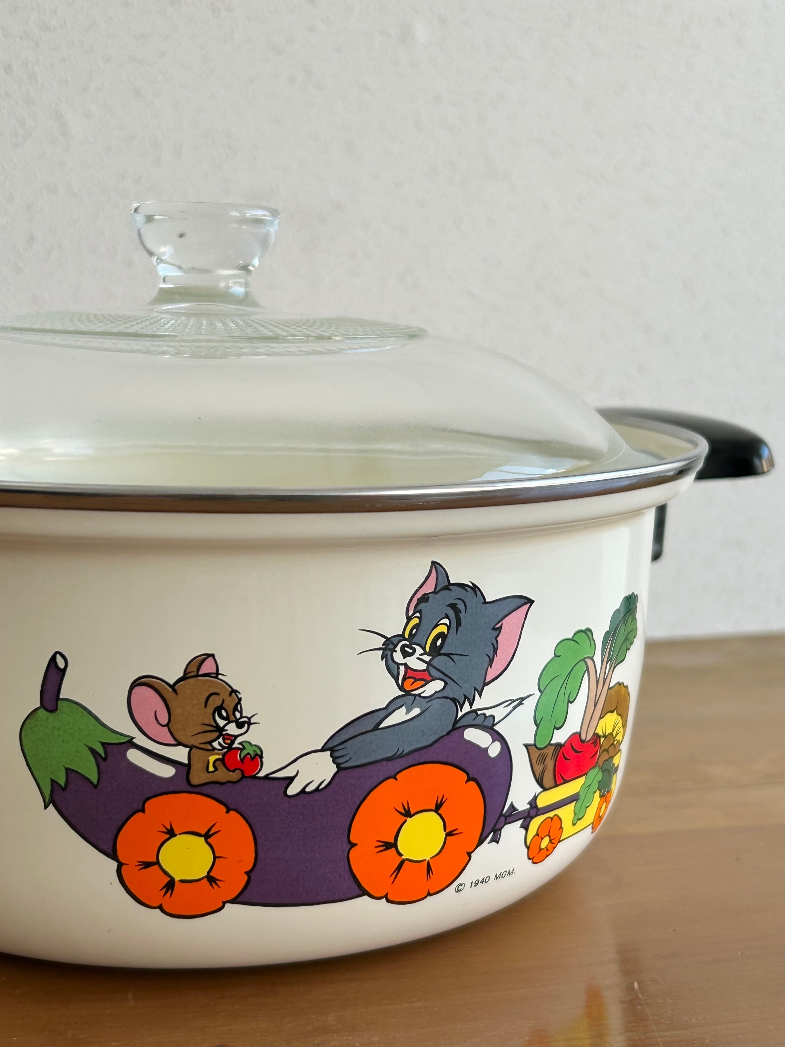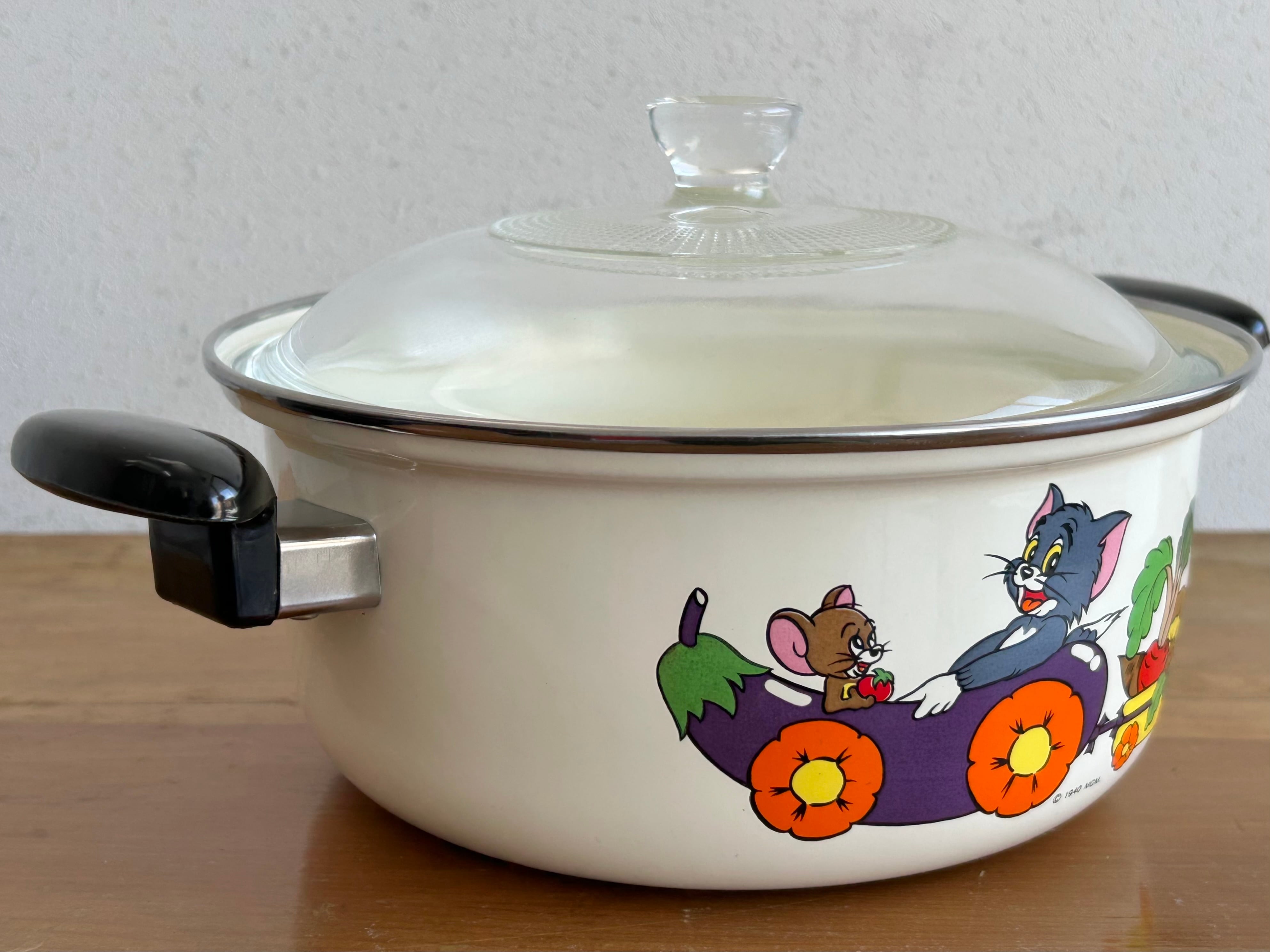 昭和期に発売された、トム&ジェリーのホーロー両手鍋です。HITACHI製のしっかりとしたつくりで、ガラス蓋付き。