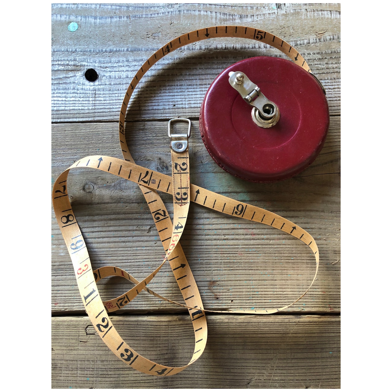 本革ケースに入った古い巻尺。