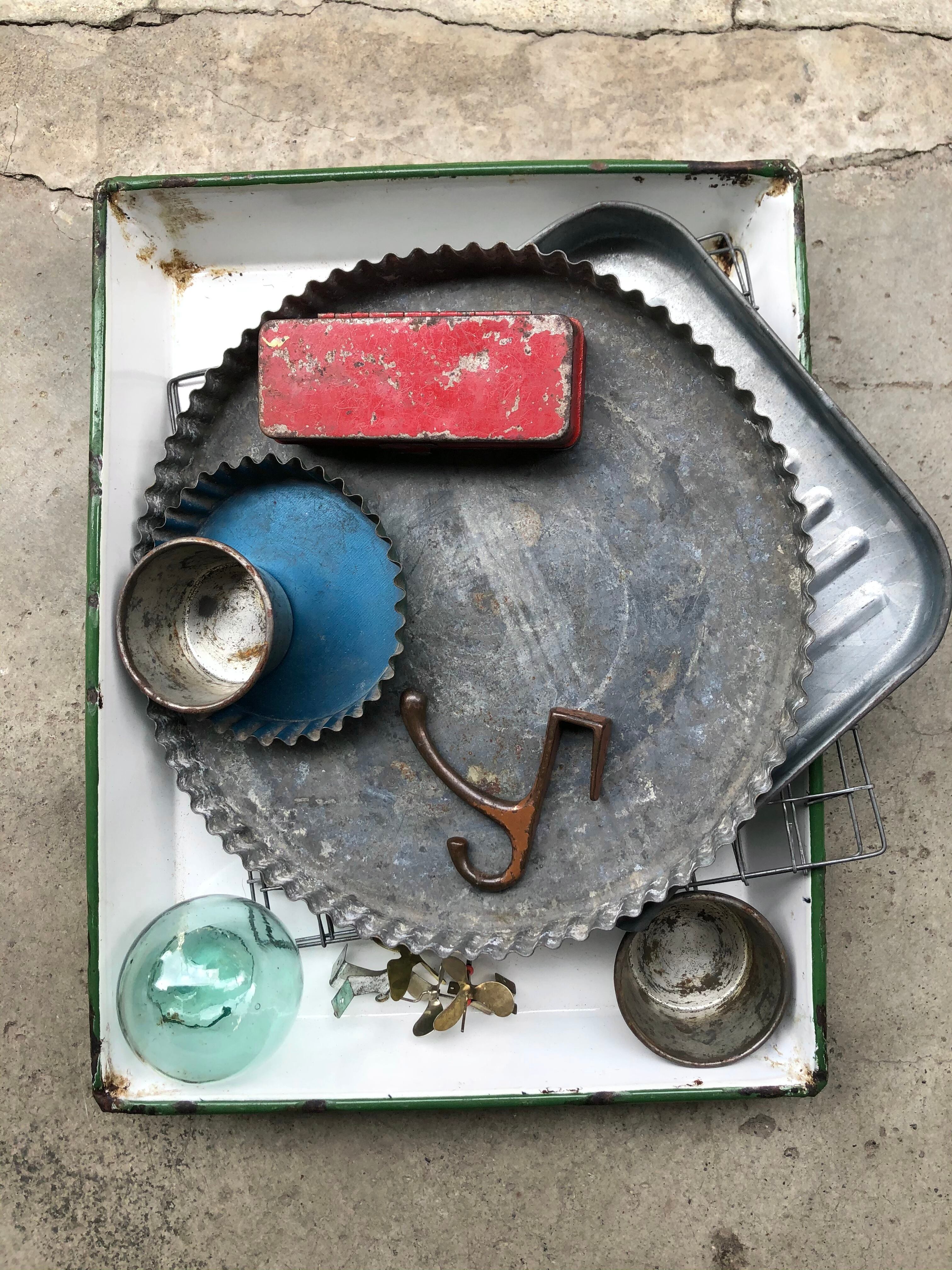 ホーロートレイとがらくたセット③ 琺瑯 錆びれたもの ブロカント インダストリアル 昭和レトロ パーツ 古道具