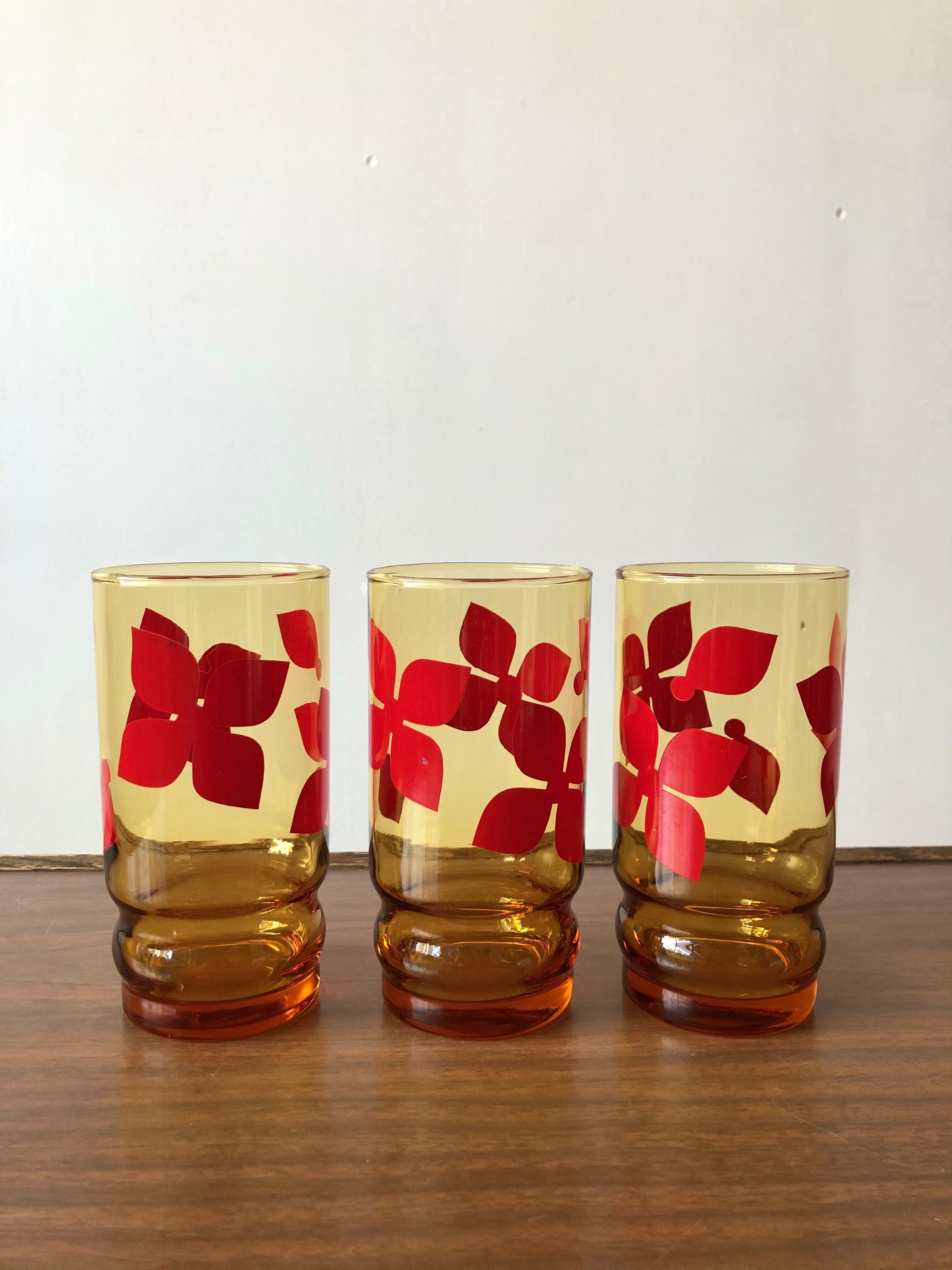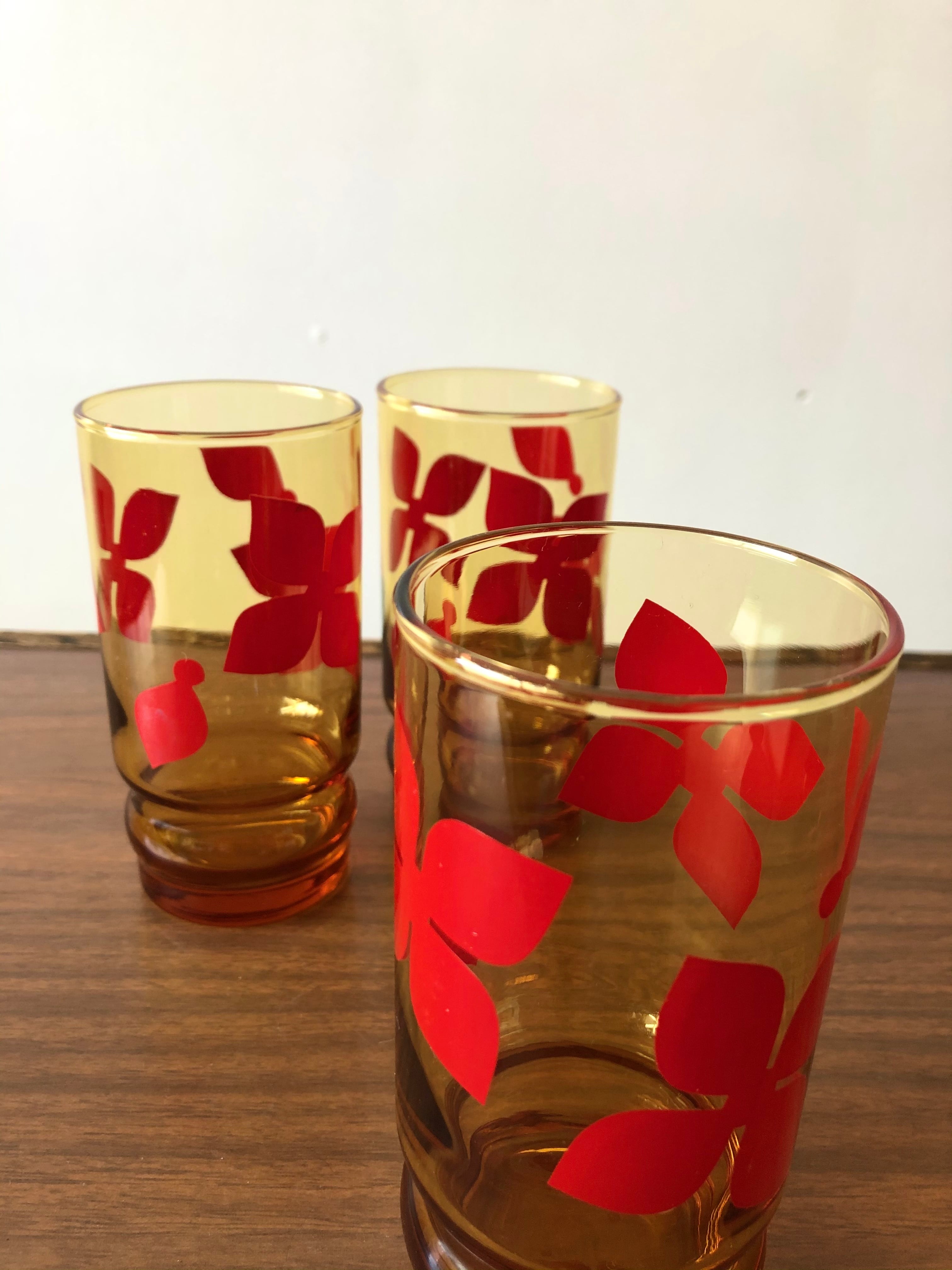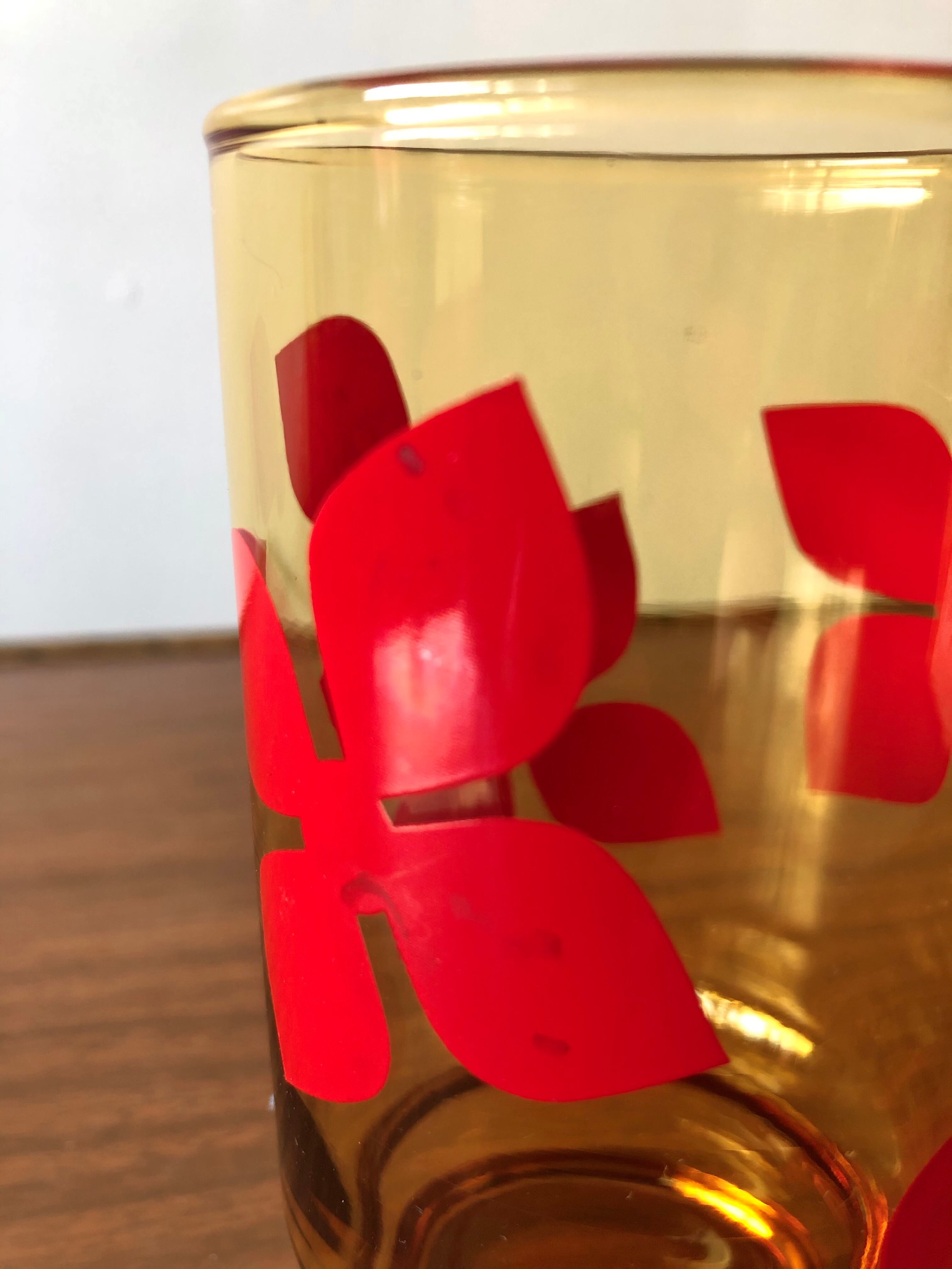 琥珀色のアンバーガラスに描かれた 真っ赤なお花のデザイン。70年代当時の物です。