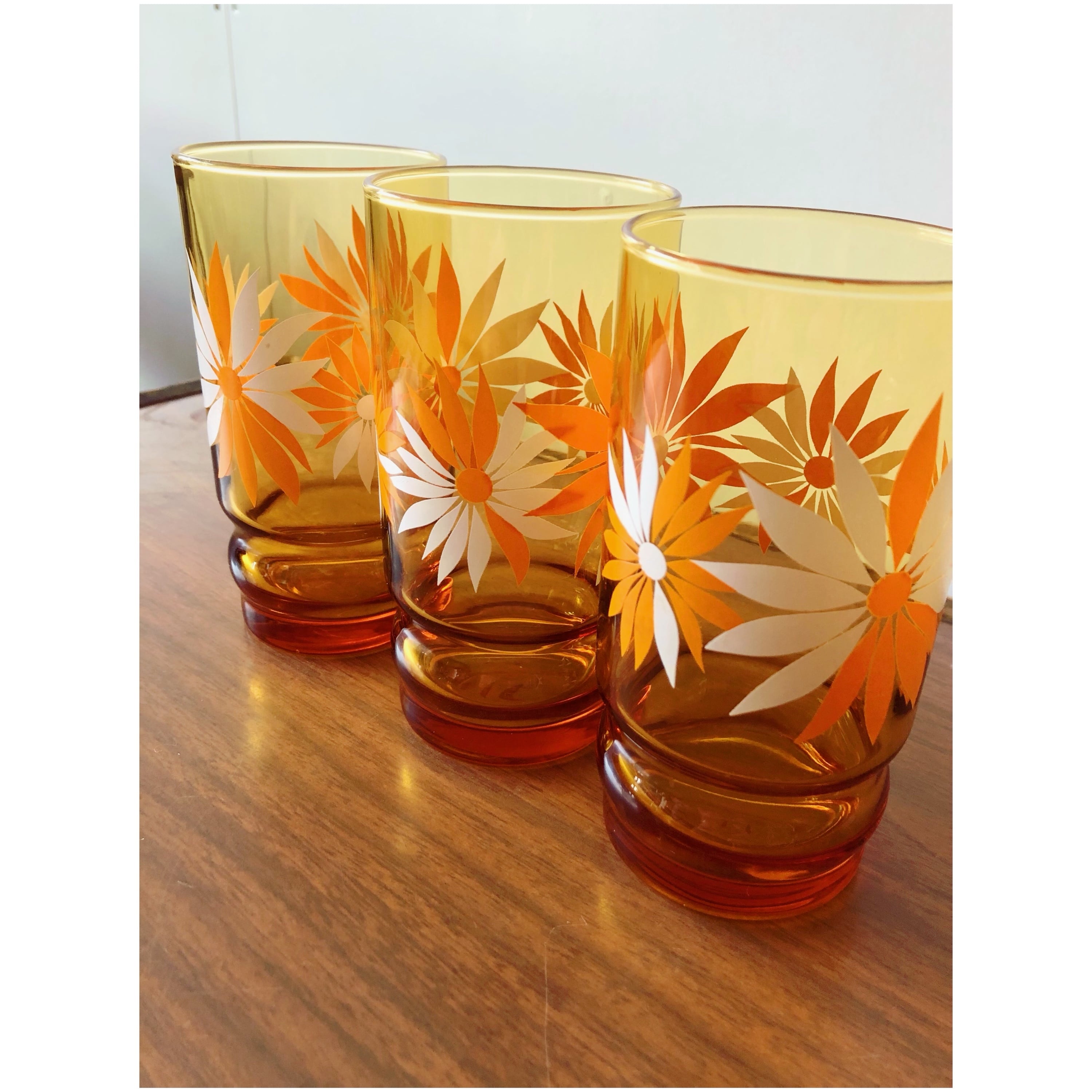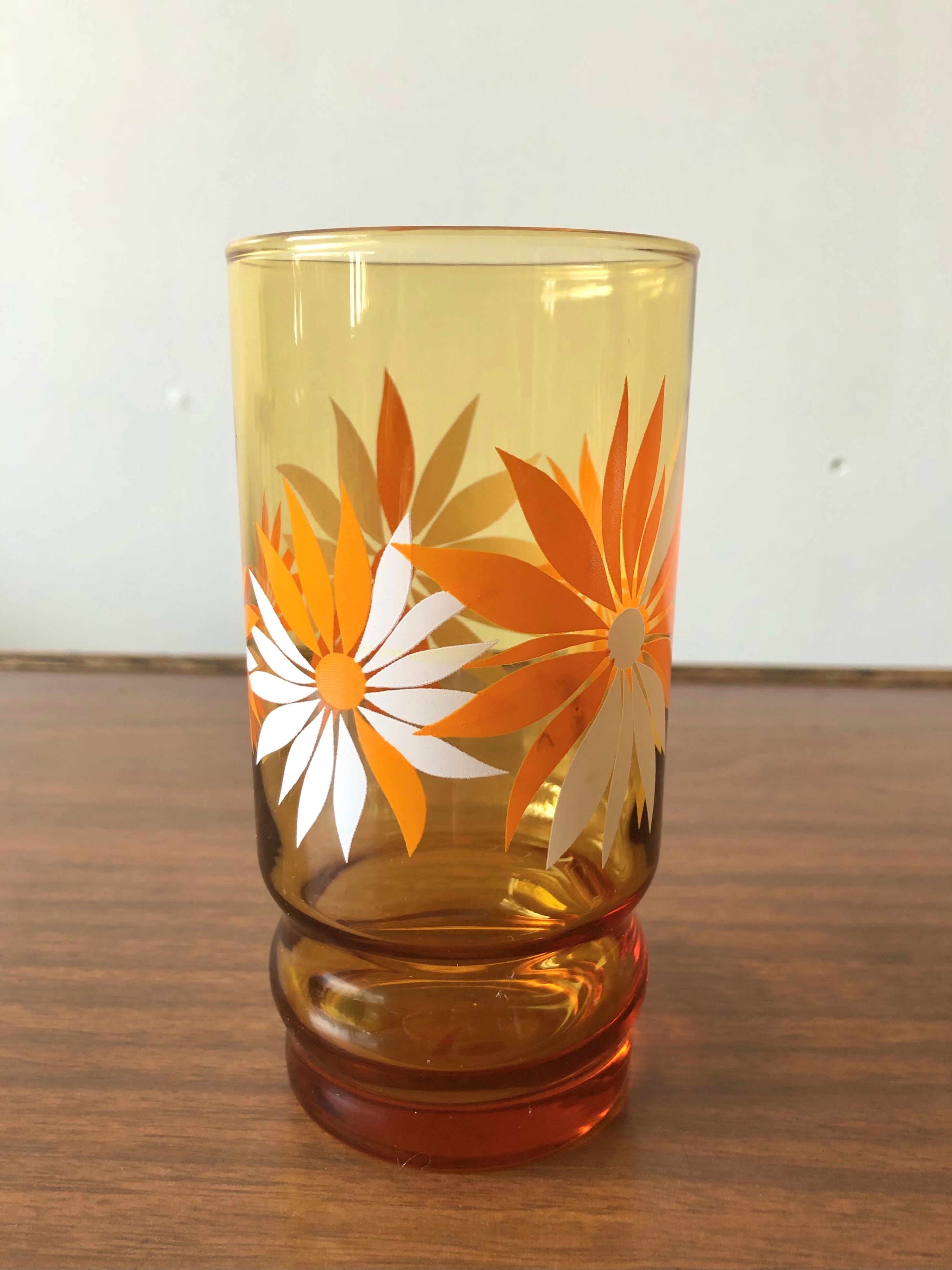 琥珀色のアンバーガラスに描かれた 花びら揺れるオレンジ色のお花。70年代当時の物です。