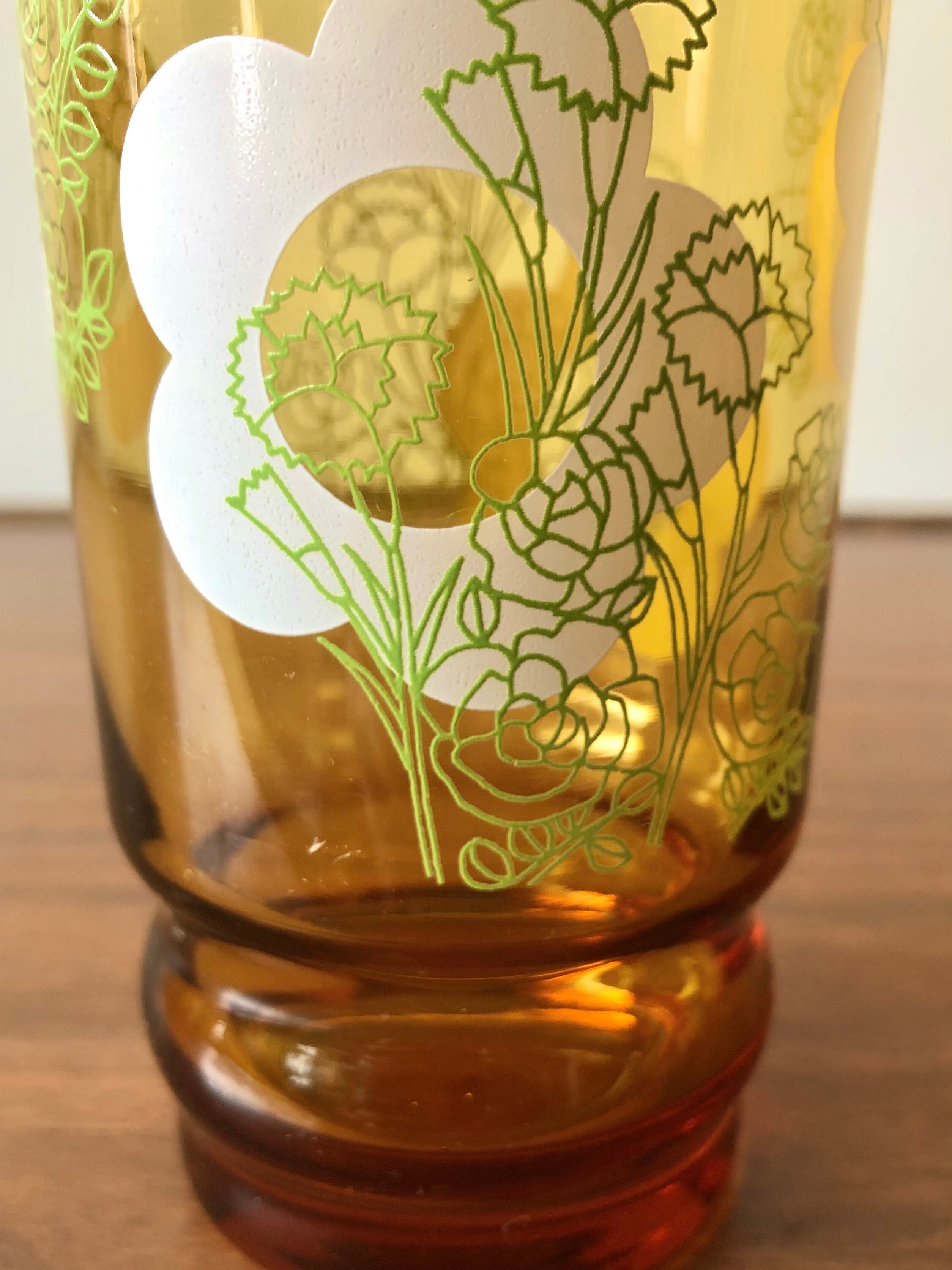 琥珀色のアンバーガラスに描かれた重なり合うお花のデザイン。70年代当時の物です。