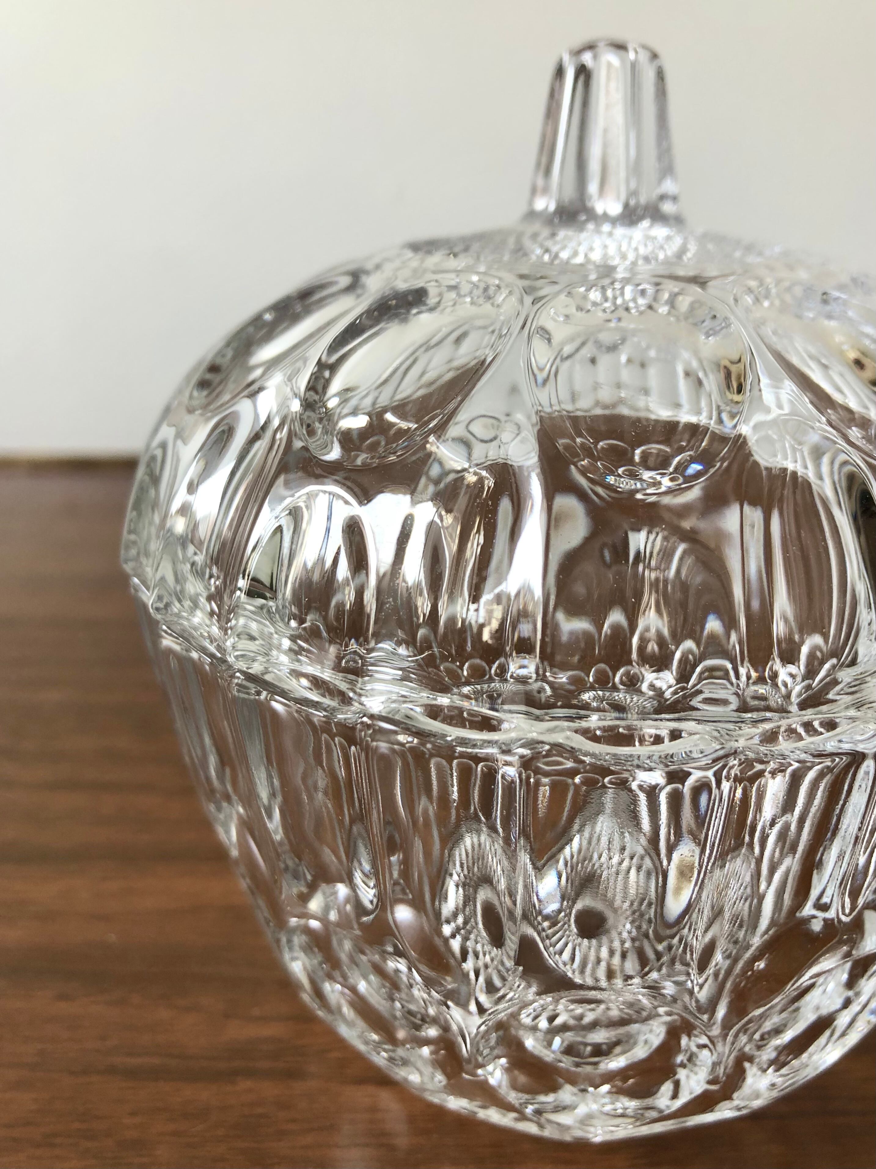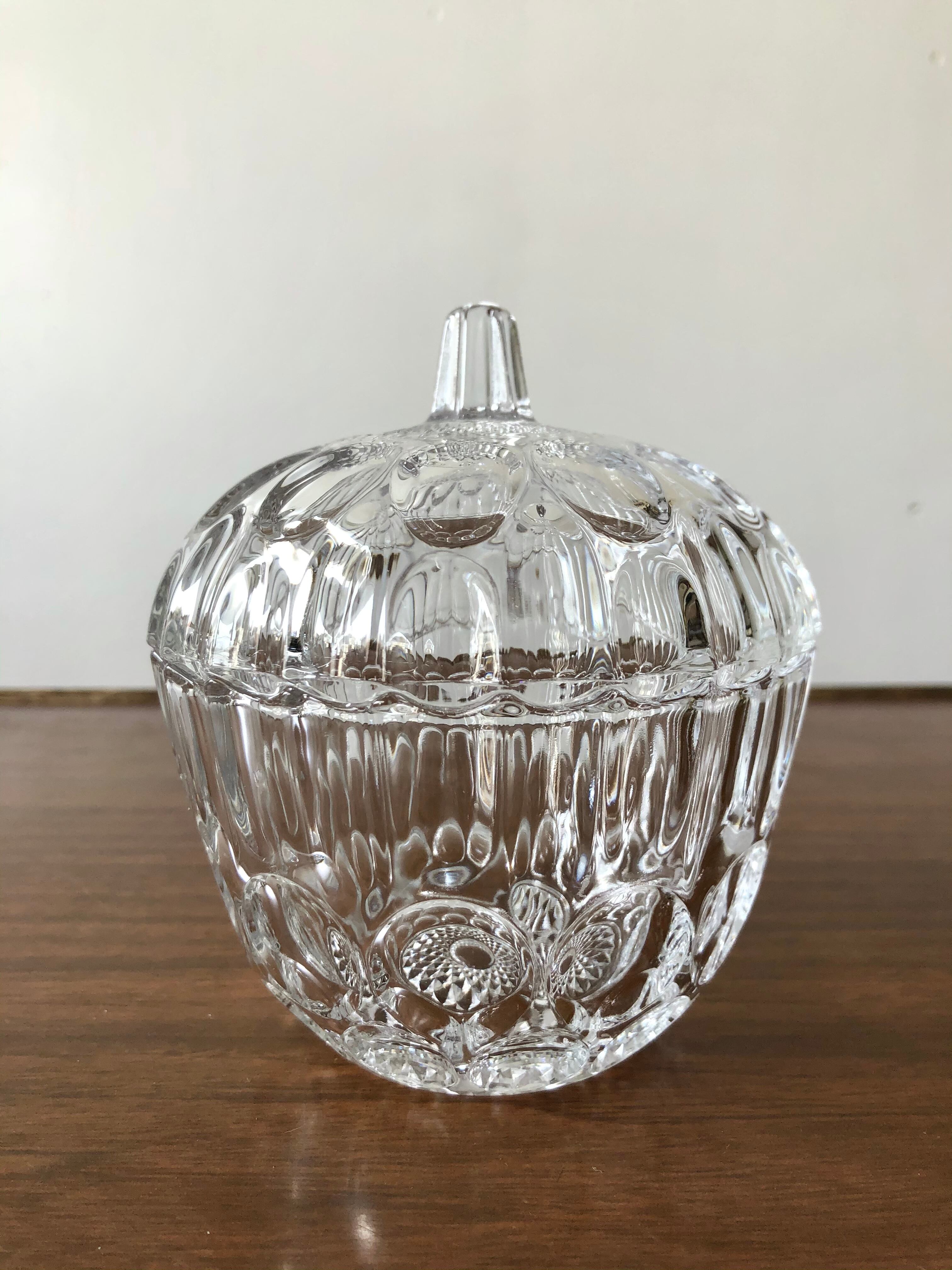 きらきら美しい模様の硝子キャニスター。蓋をした姿はりんごの様にも見えますね。
