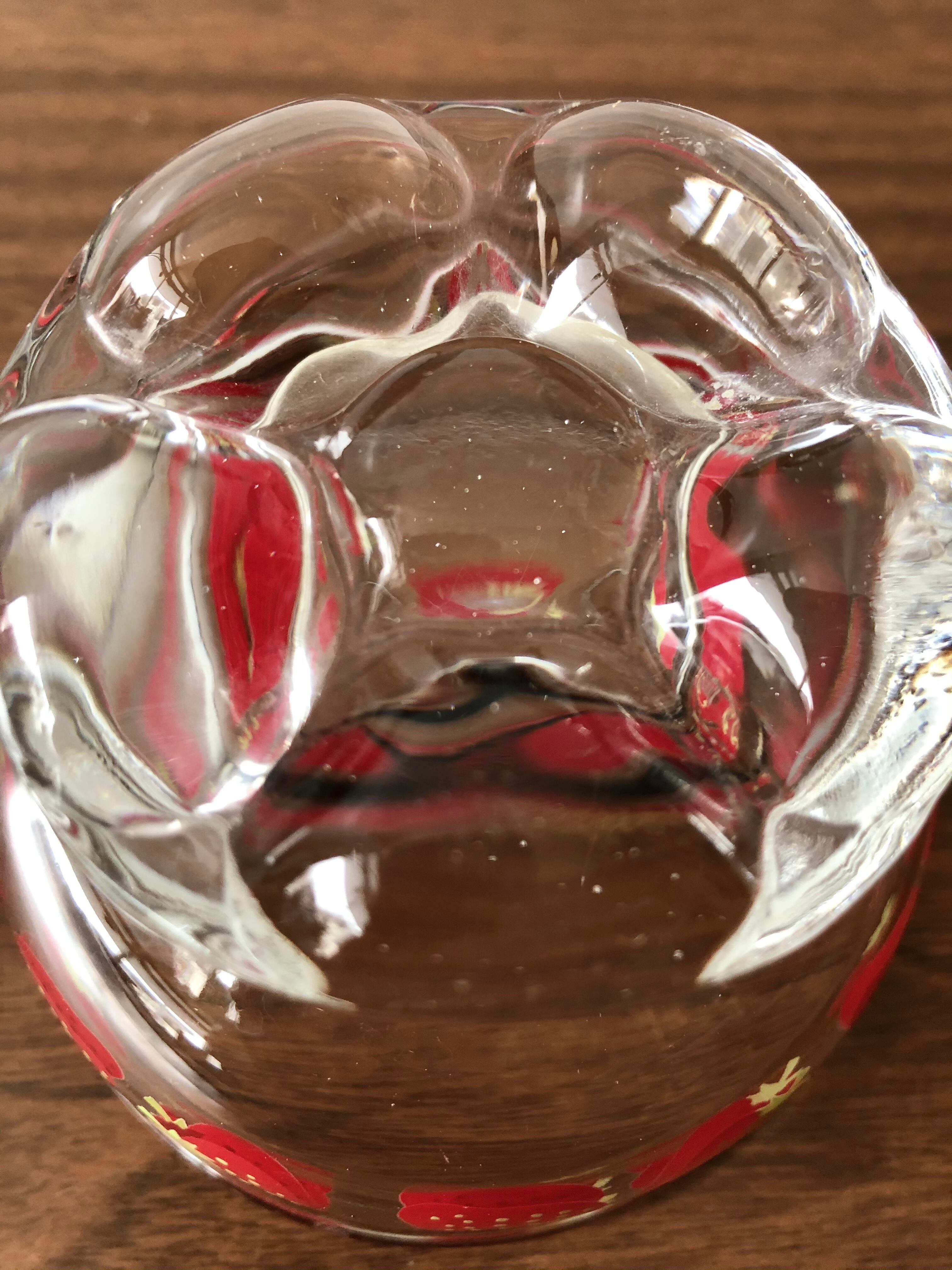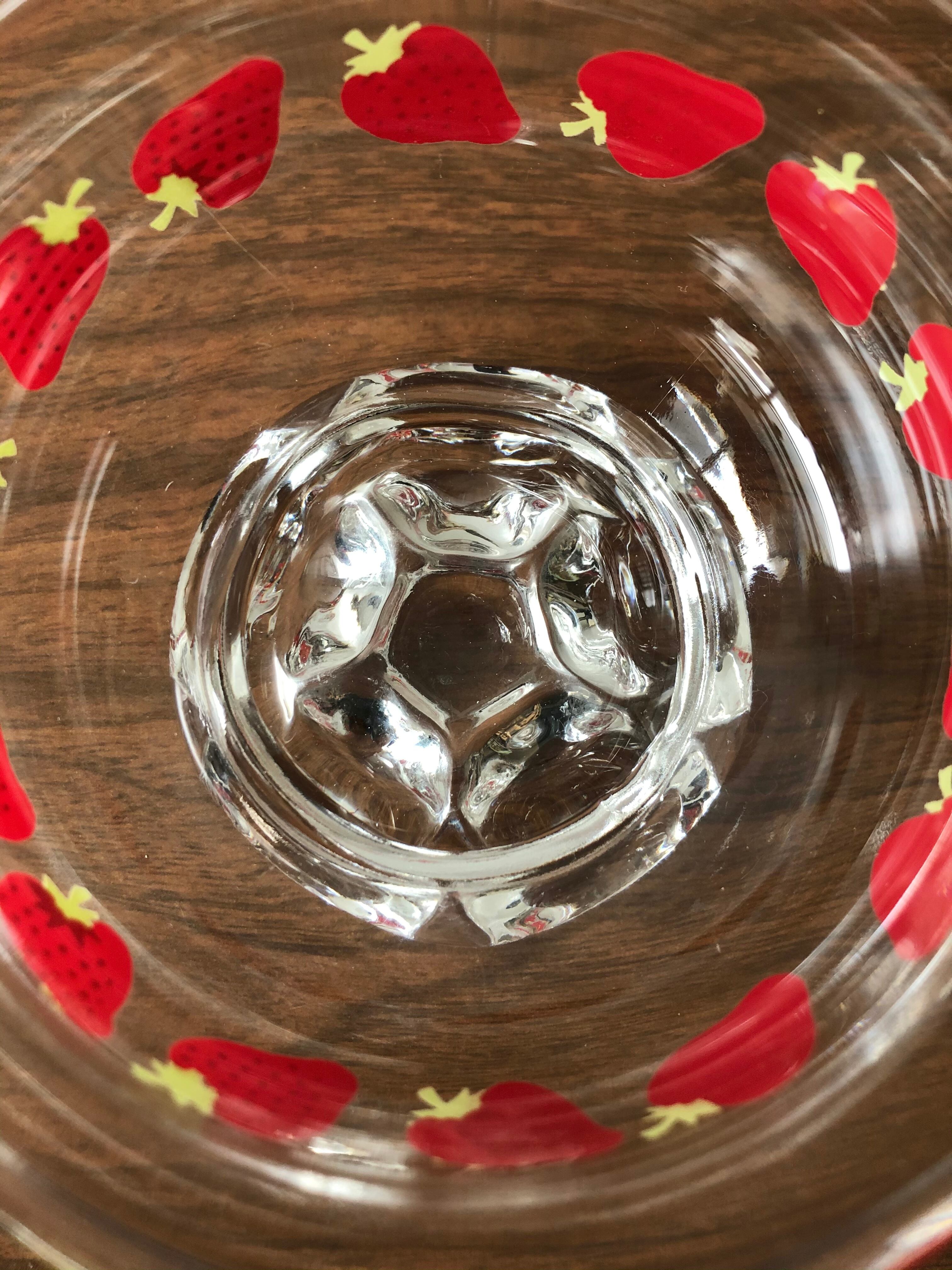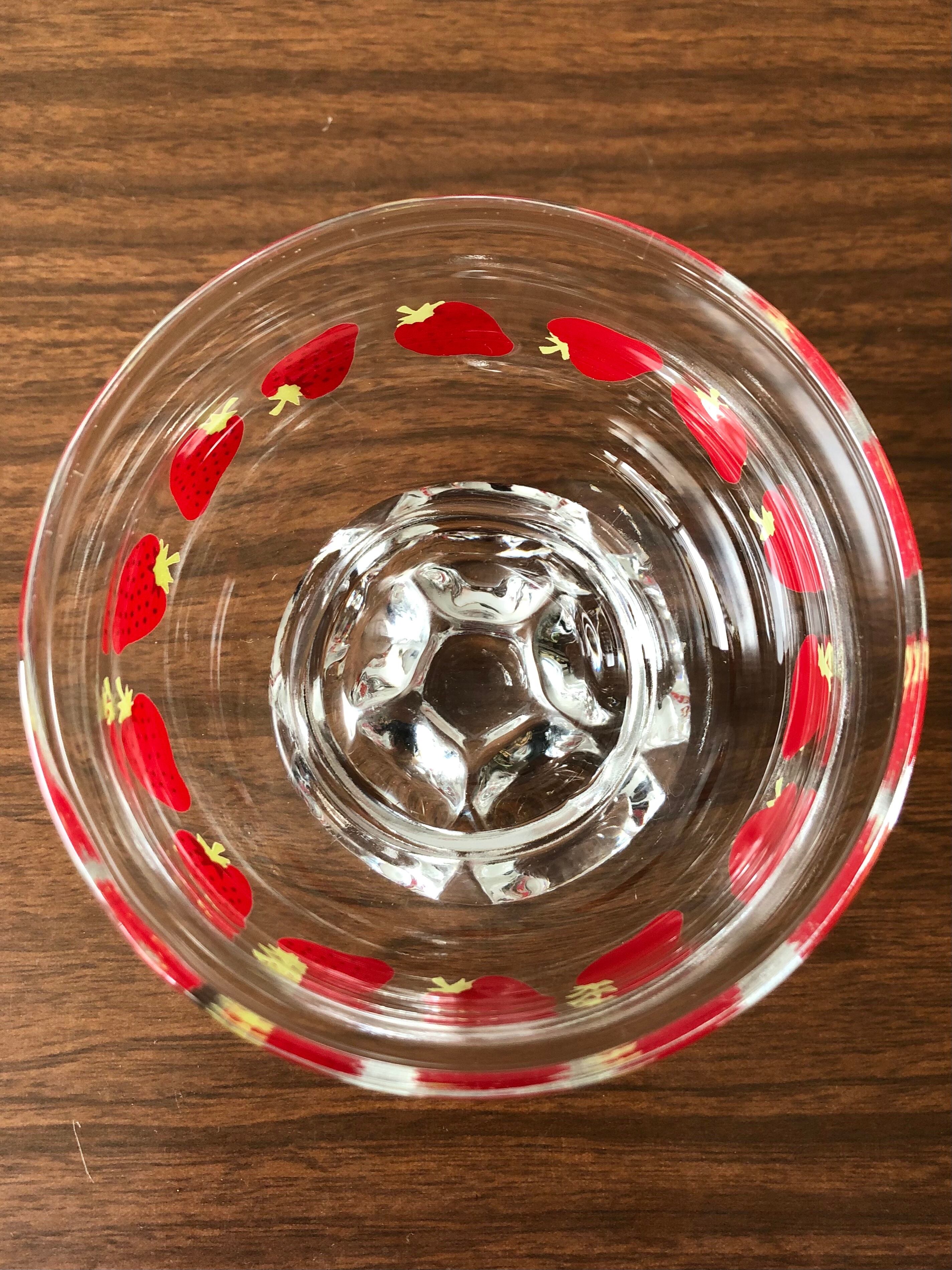 ぽてっとしたボディと、いちごのプリントがとっても可愛い デザートグラス。4点セットです。