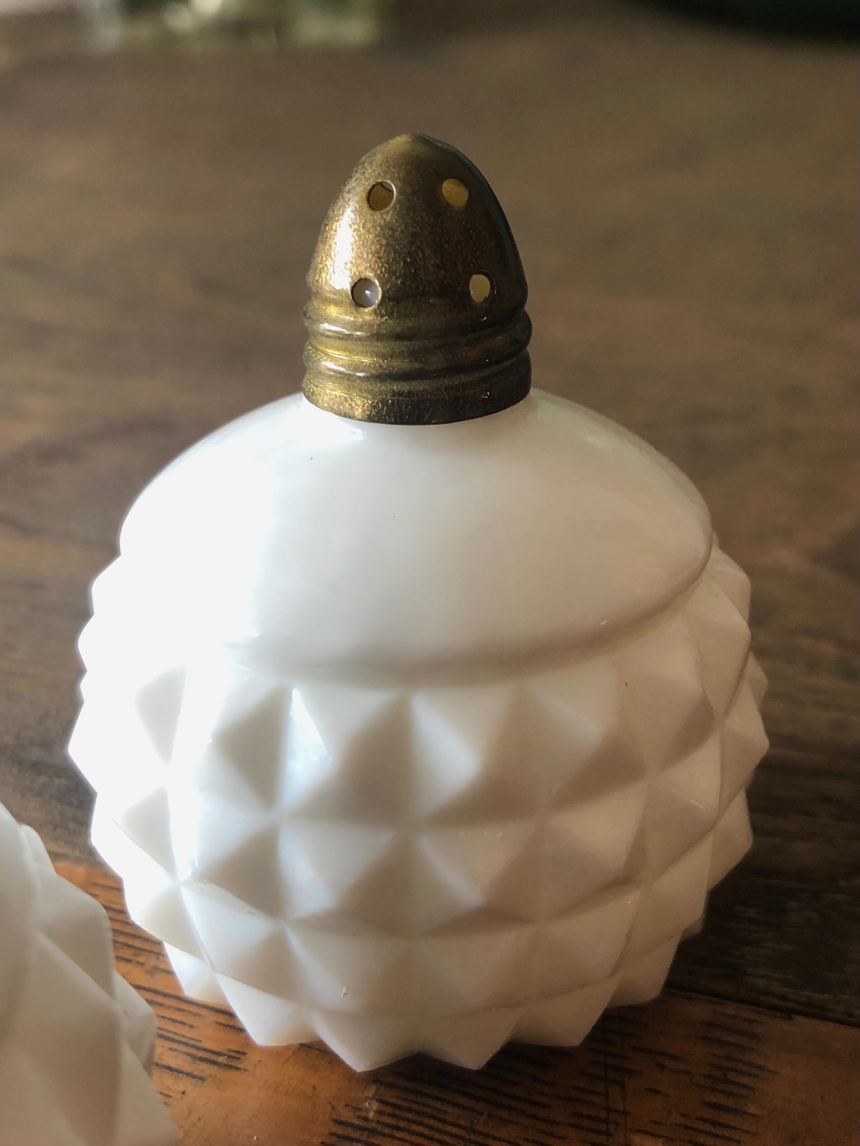 爽やかな乳白色のミルクガラスでできたソルト&ペッパーセット。