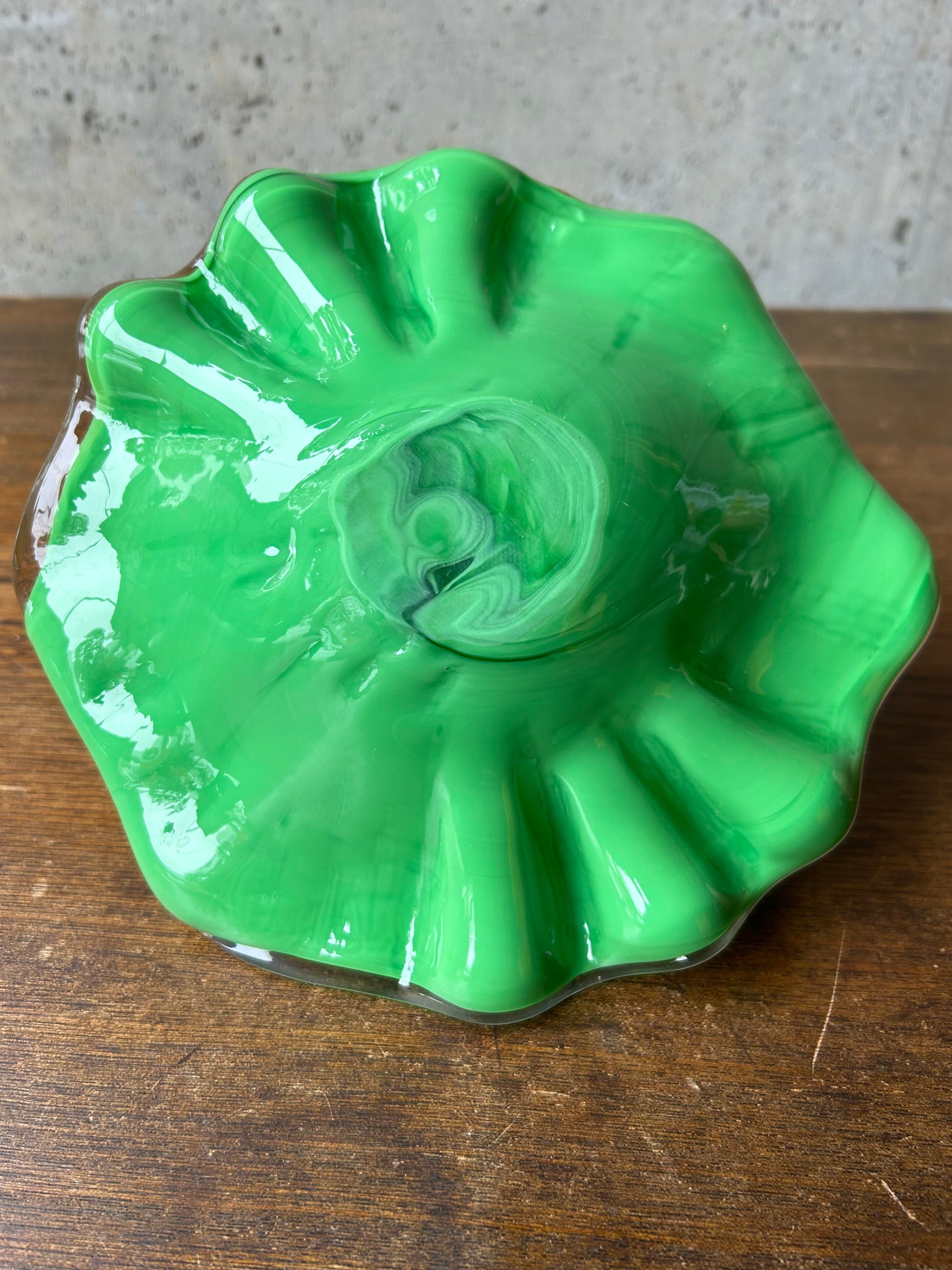 ポップで華やかな緑色 フリルが美しい硝子皿。持ち手も付いています。